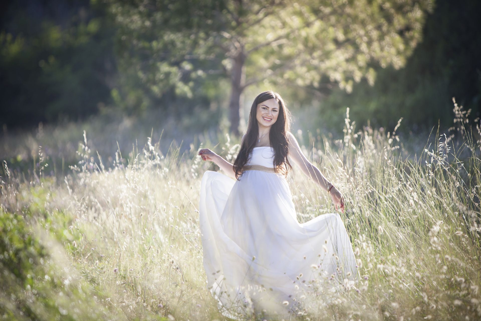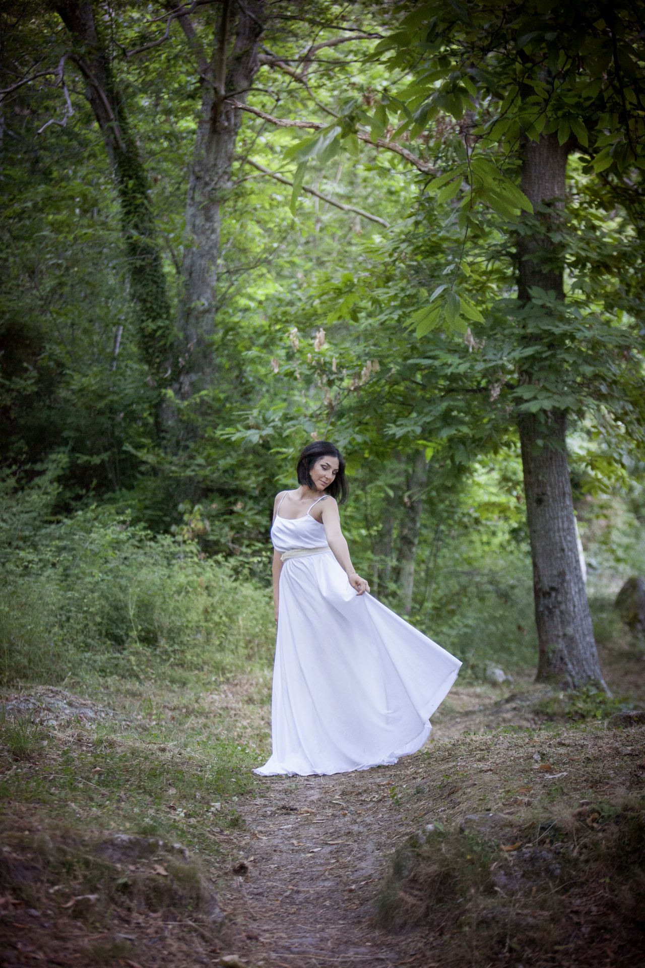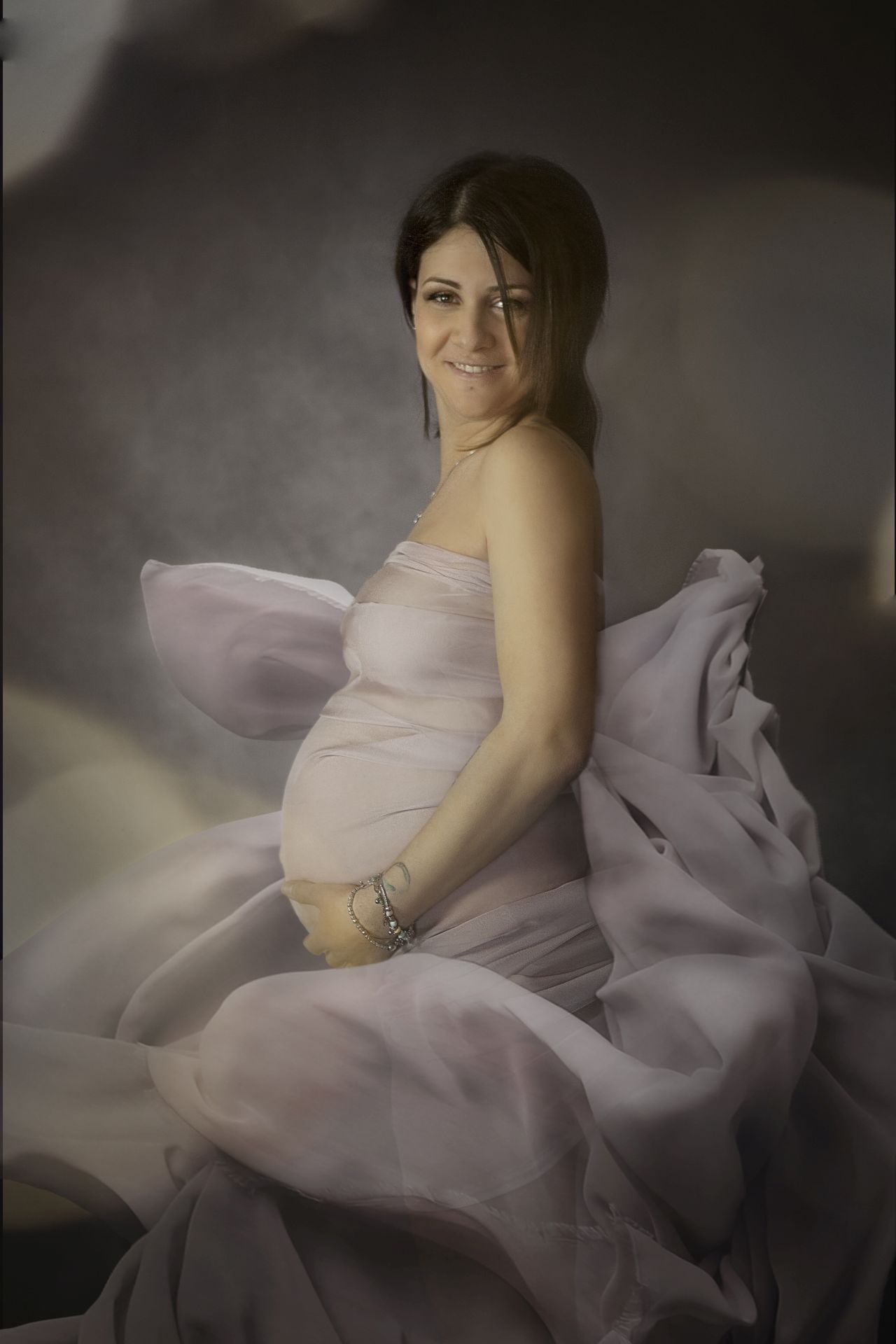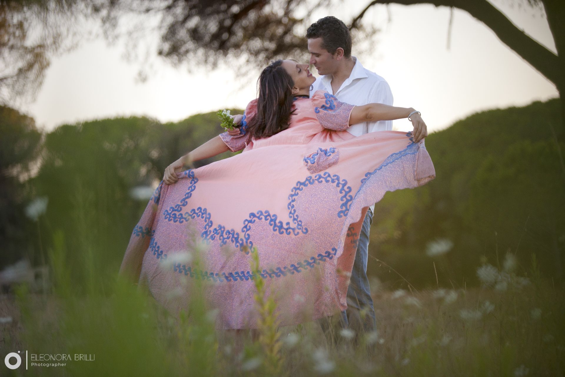 Abito leggero ma ben strutturato con gonna ampia che consente anche un utilizzo negli scatti Maternity ma non vi fate ingannare è una taglia 42! Non adatto a seni abbondanti, immancabile un velo leggerissimo in sfumatura di colore.