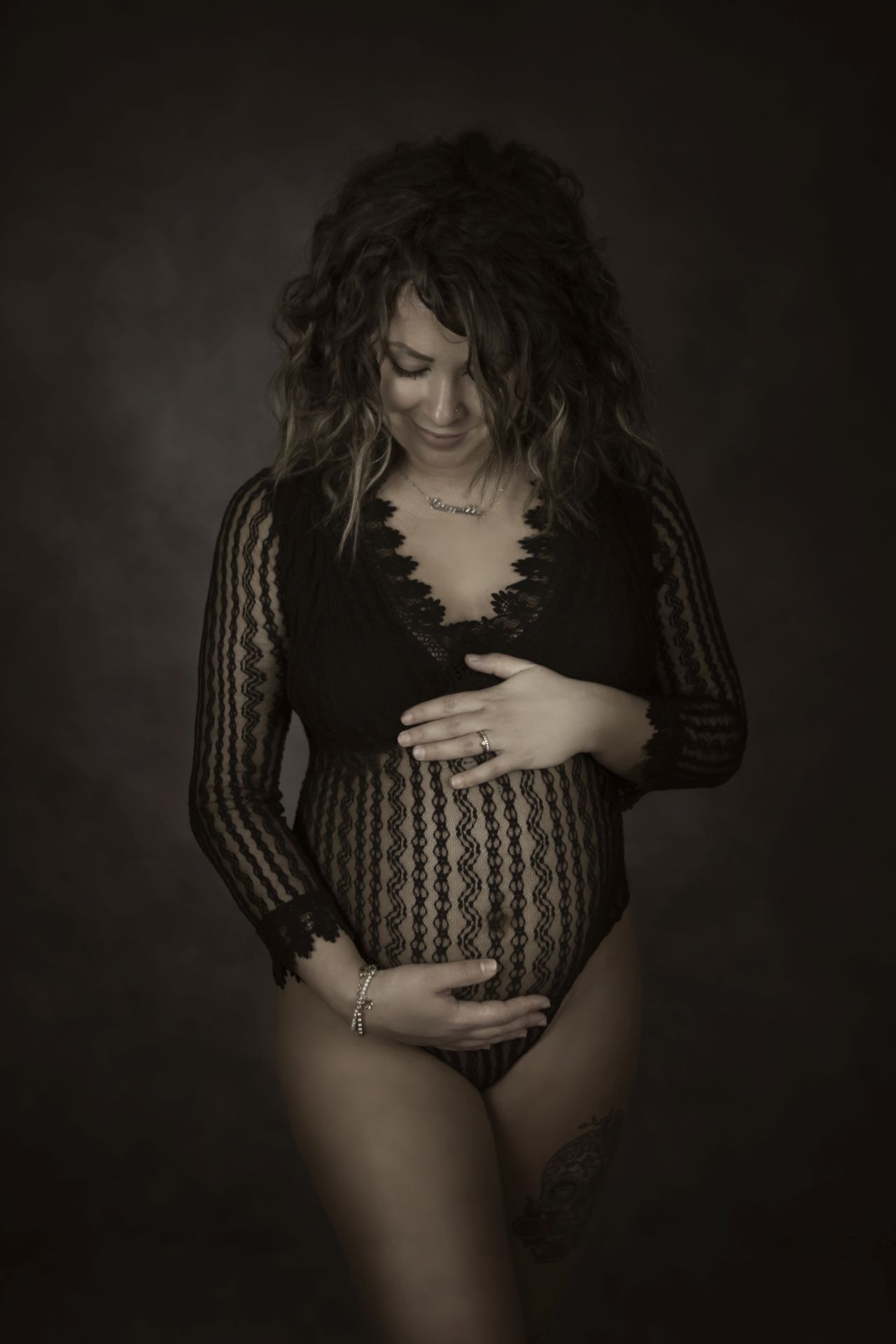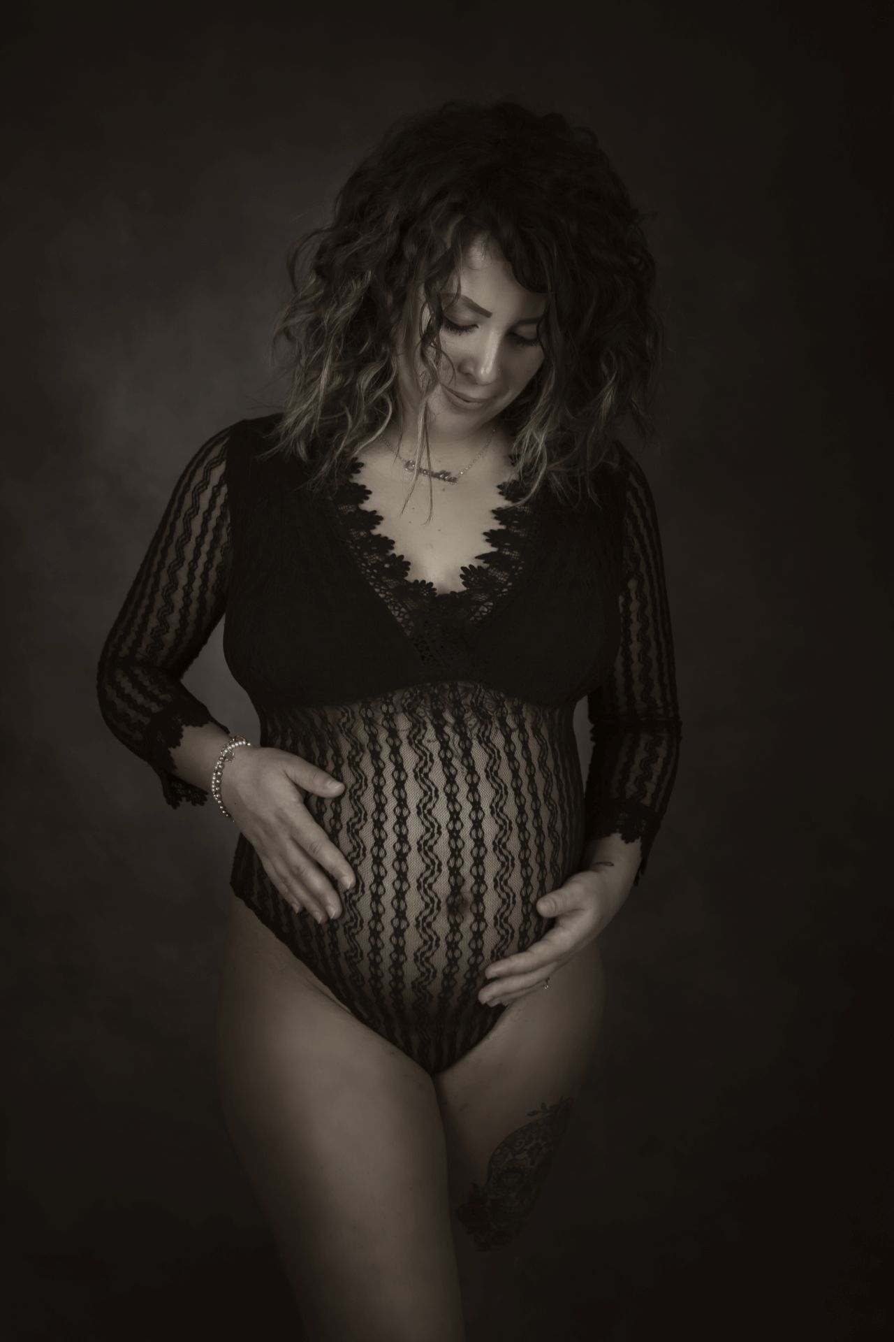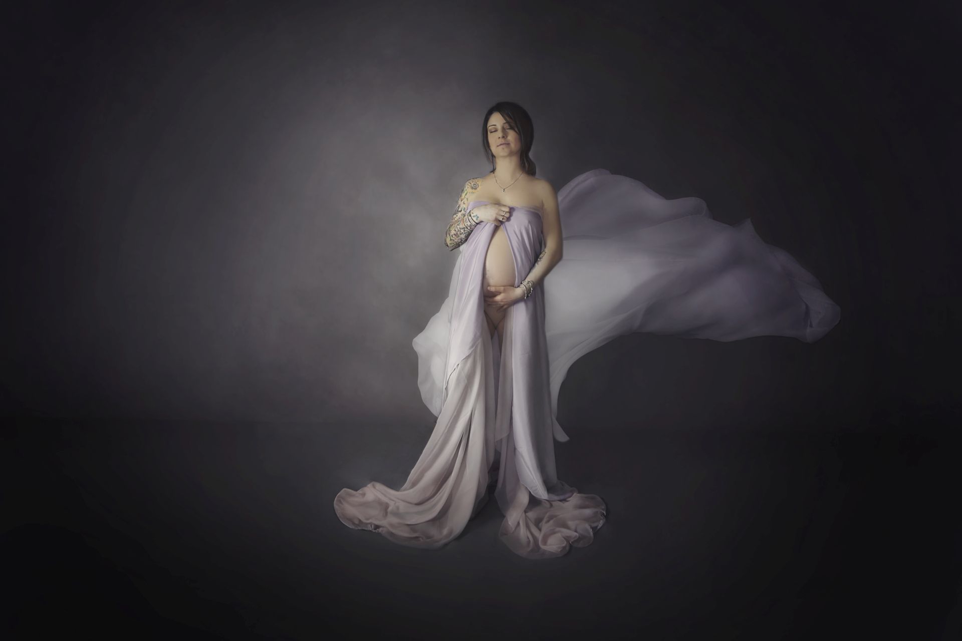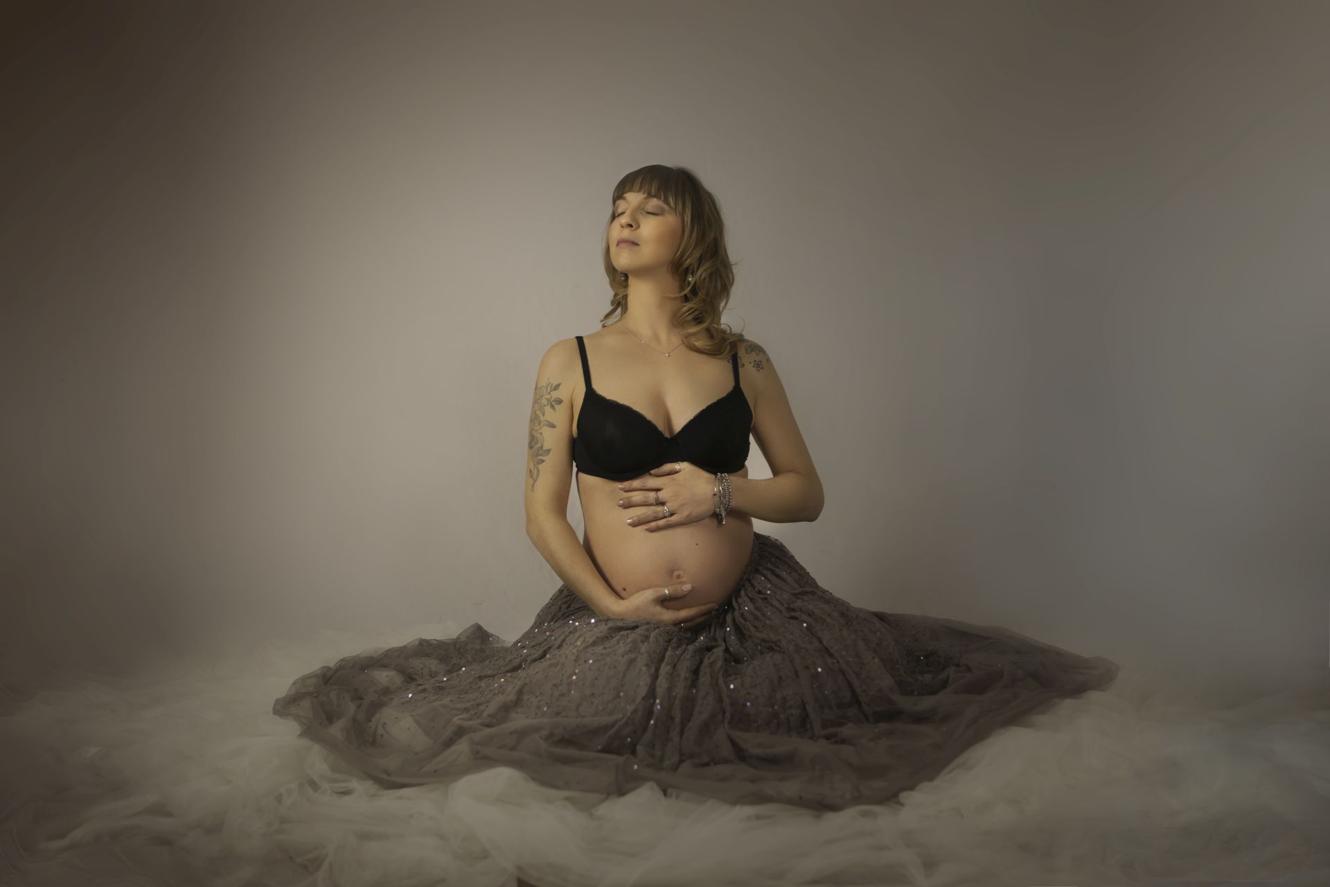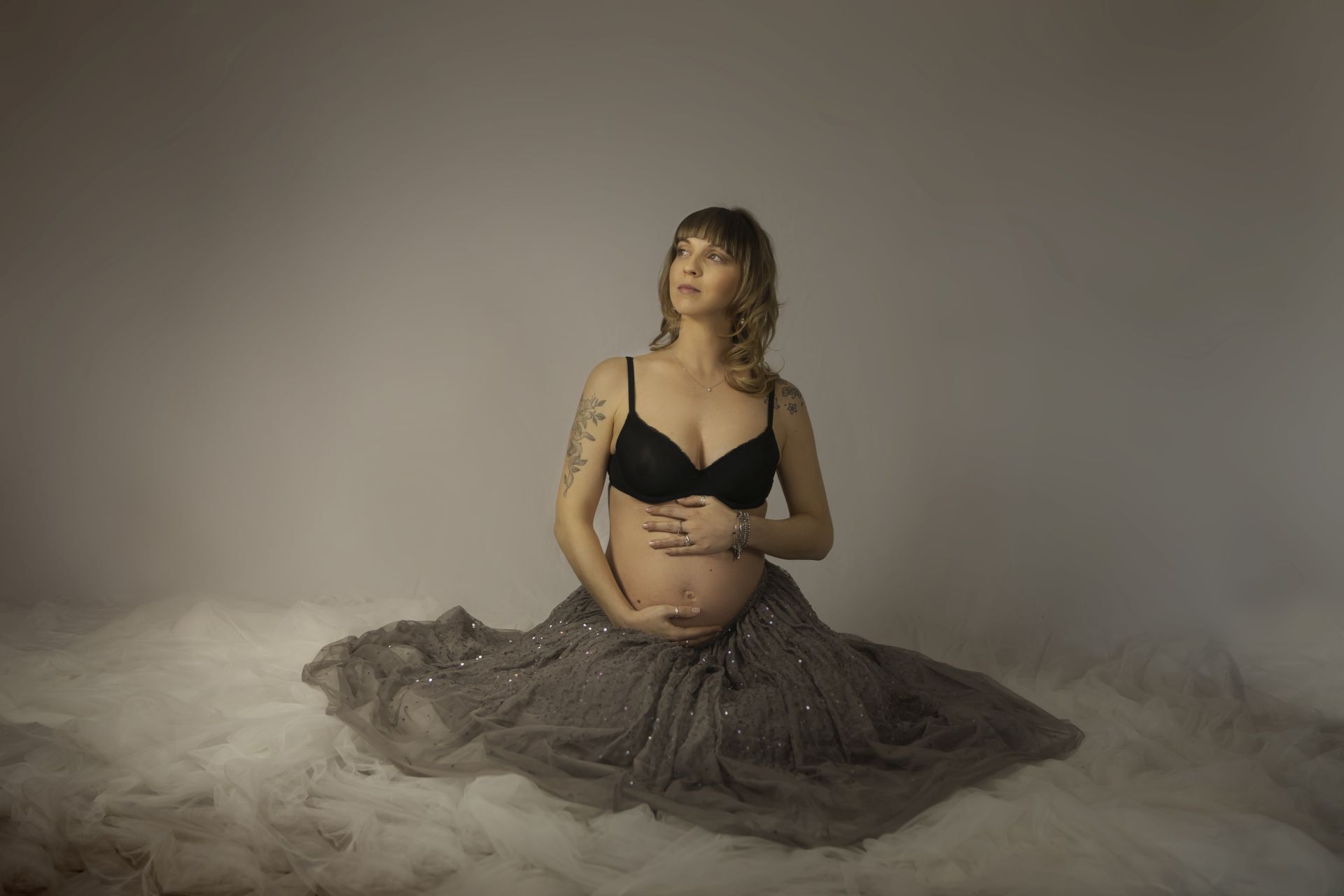 Il corpetto con manica a pipistrello ha una lavorazione verticale che copre le trasparenze mentre la gonna è un sovrapporsi di tulle voluminso ma che si appoggia bene sulle curve. Per maternity e non solo!
