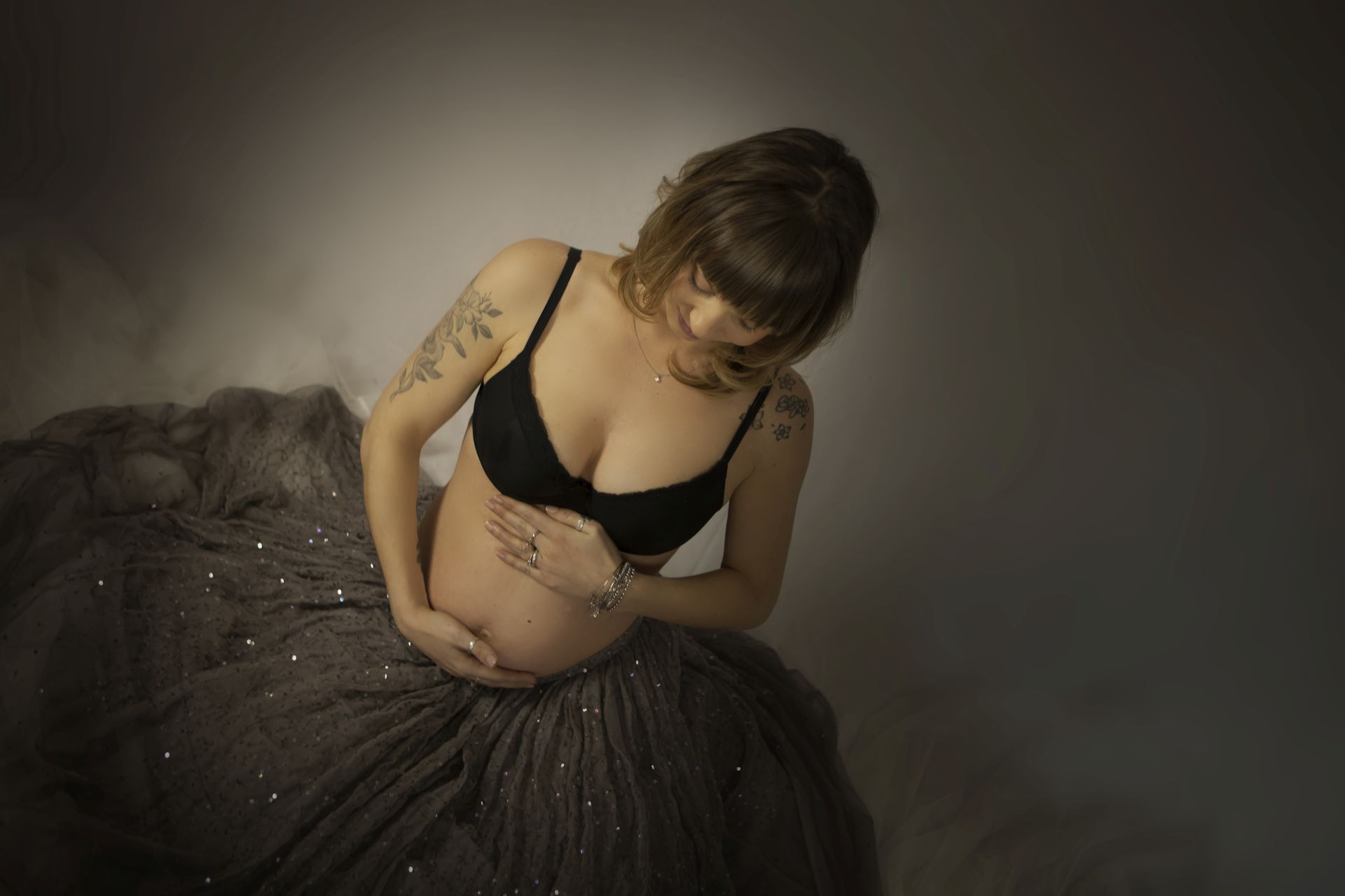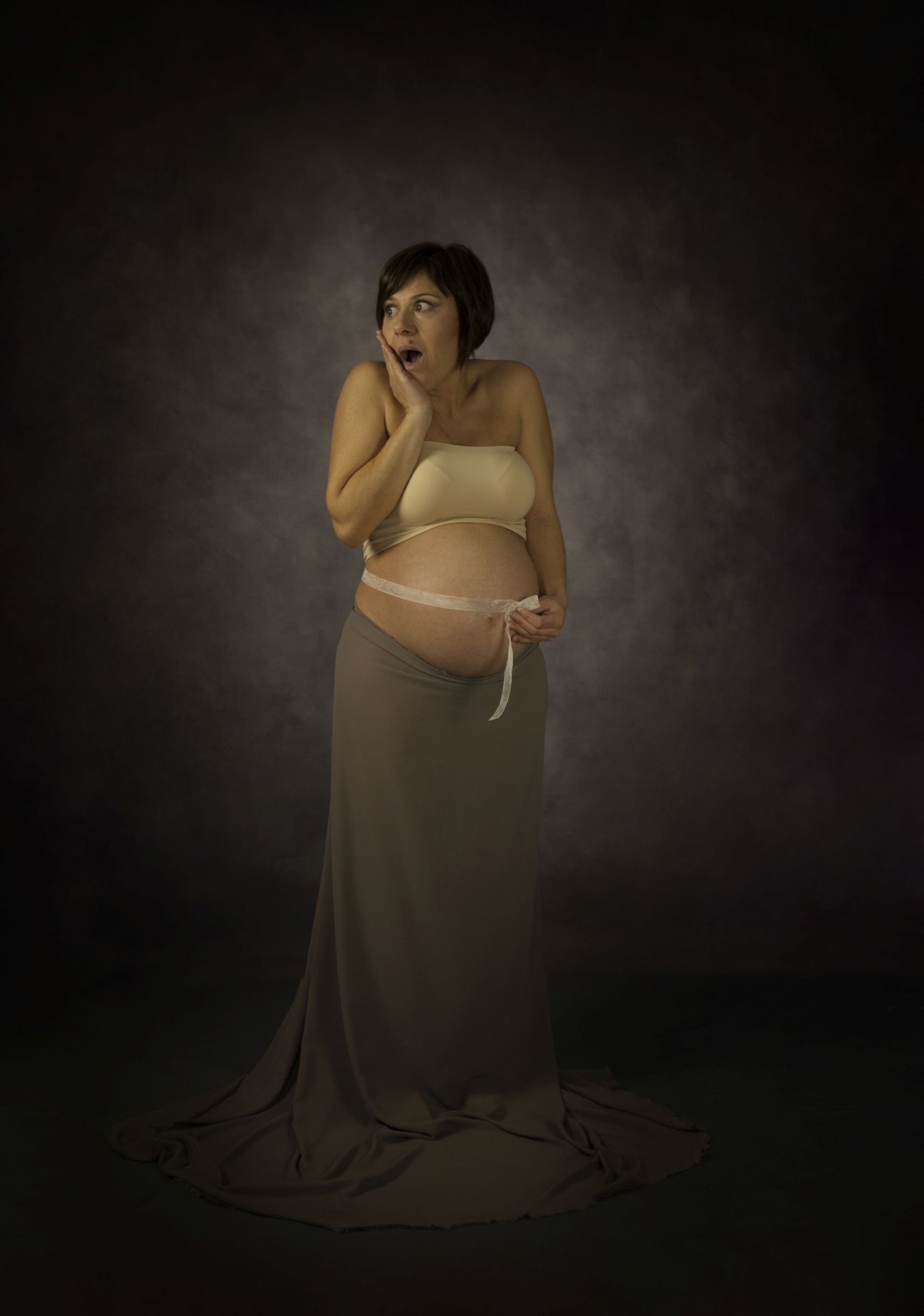 Ampia gonna color tortora composta da mille strati vaporosi! Mille piccole paillette bronzo la fanno brillare sotto i miei riflettori!