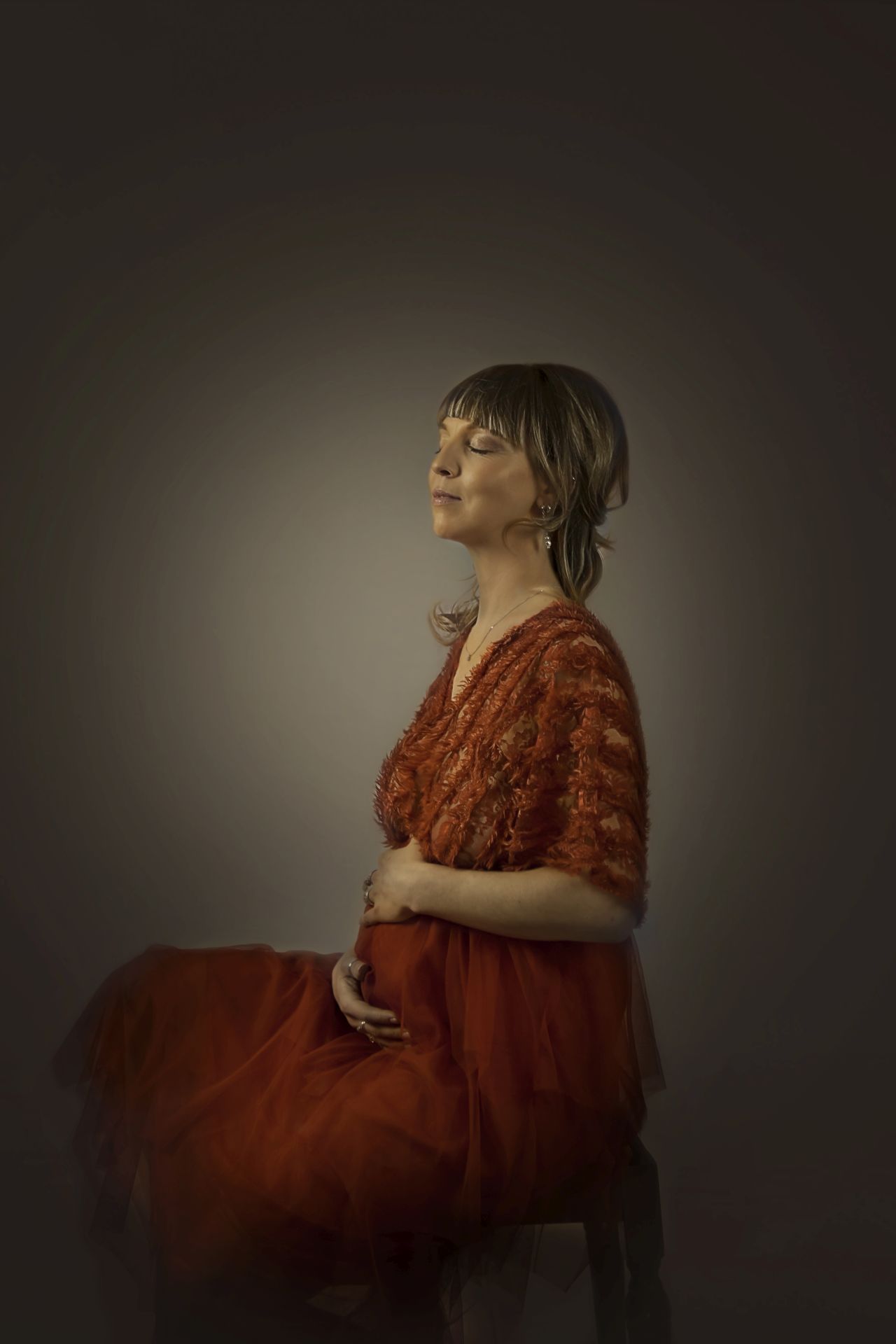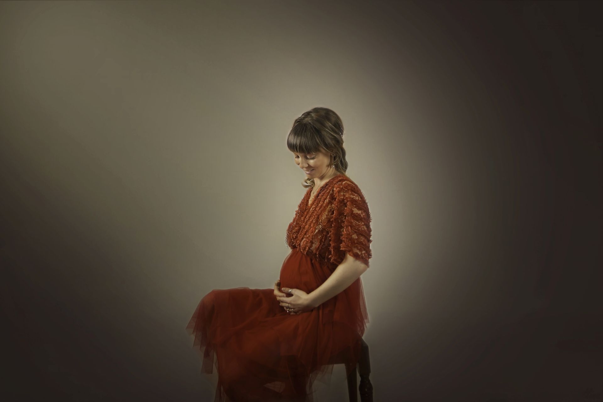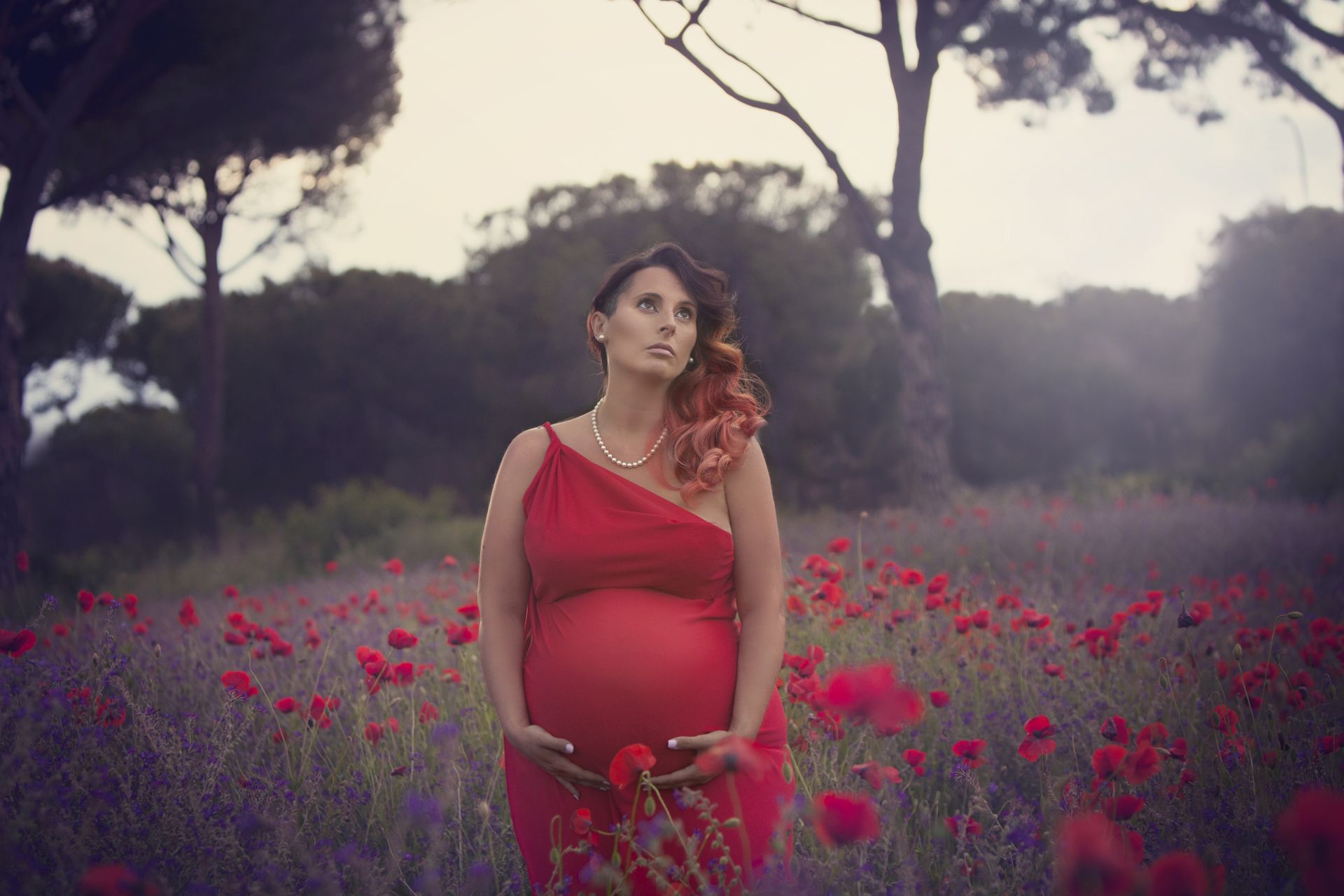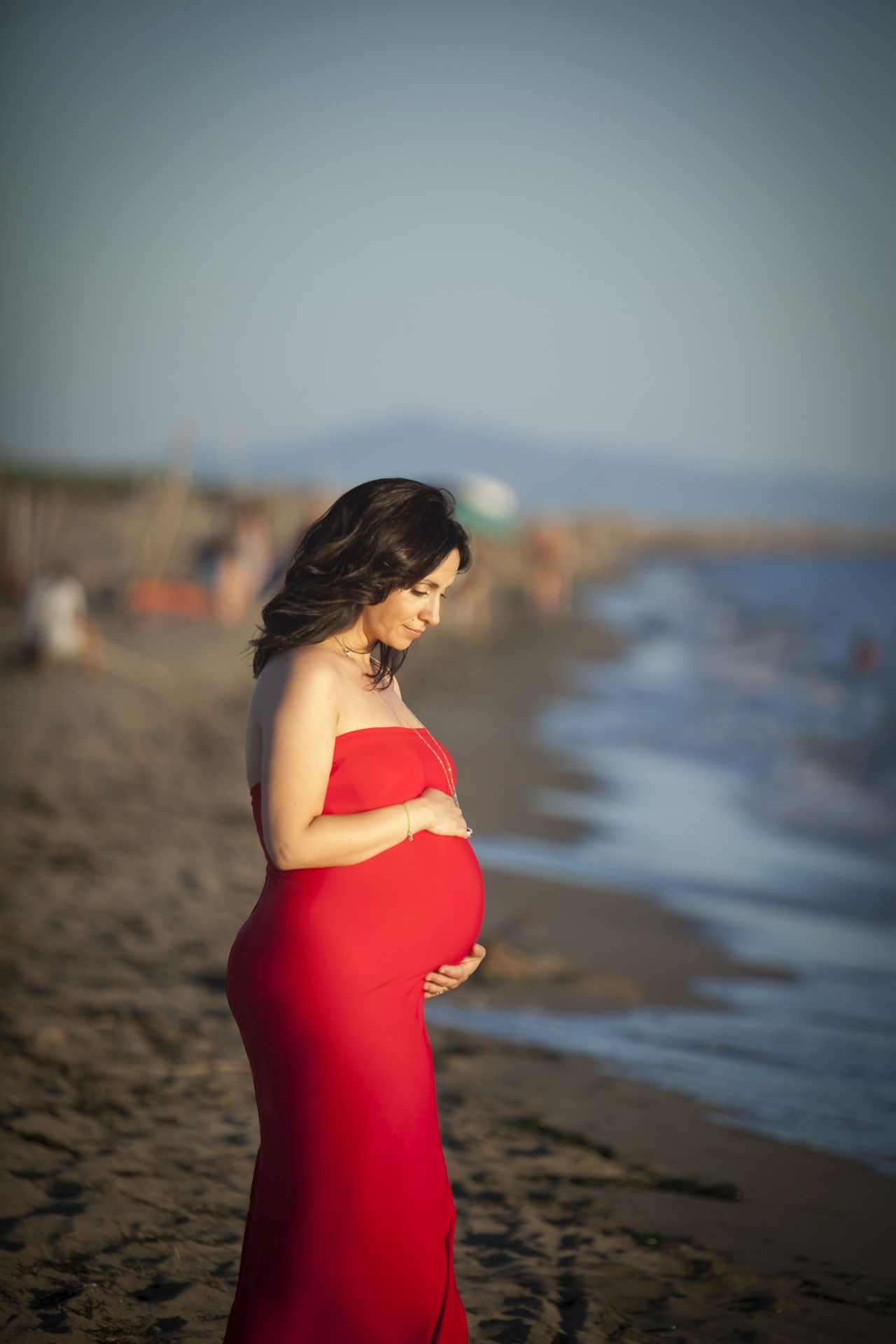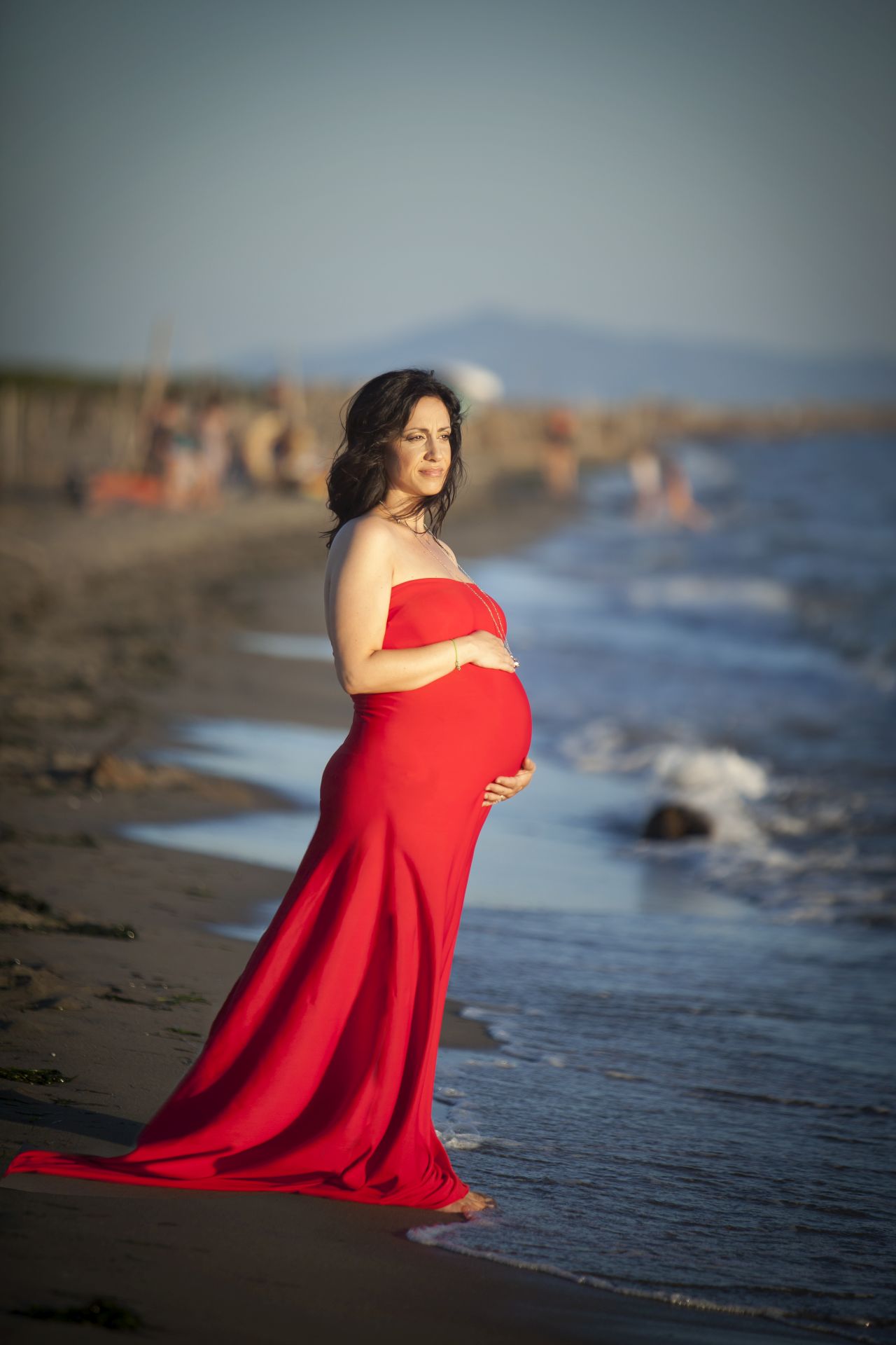 Abito in maglina rosso profondo, il modello elasticizzato si presta bene sia per taglie diverse che per i servizi Maternity, da valorizzare con una delle tante fasce colorate a vostra disposizione e con una stola o mantella.