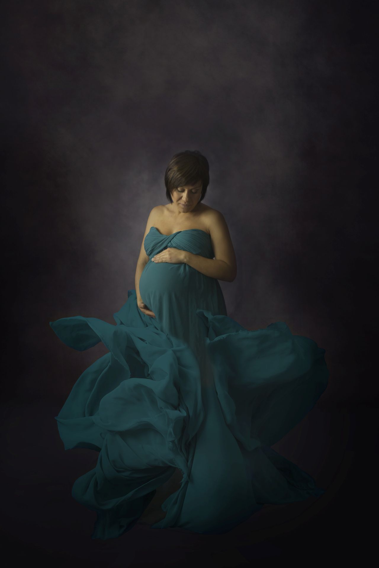 Abito in voile color ottanio, gonna ampia e corposa, corpetto plissettato e robusto. perfetto per i servizi maternity ma adatto anche ad una taglia 48.